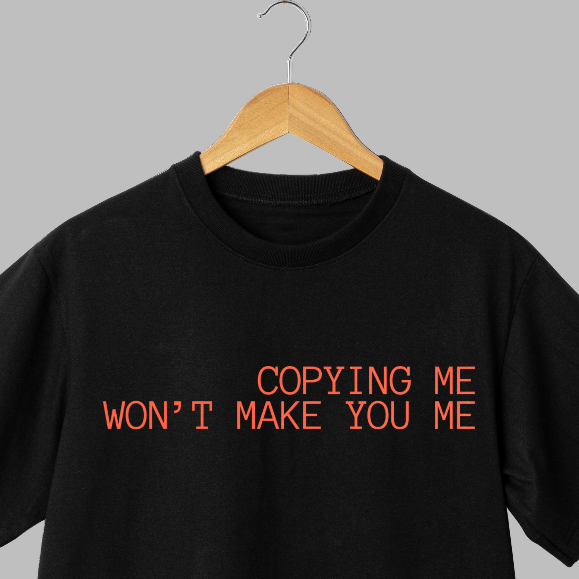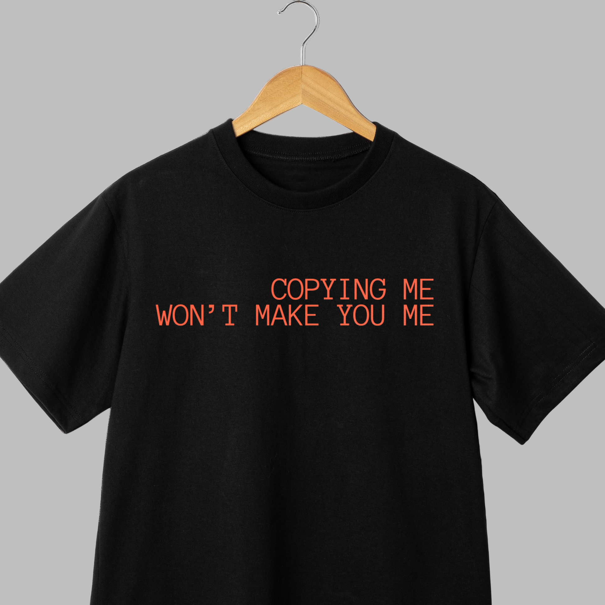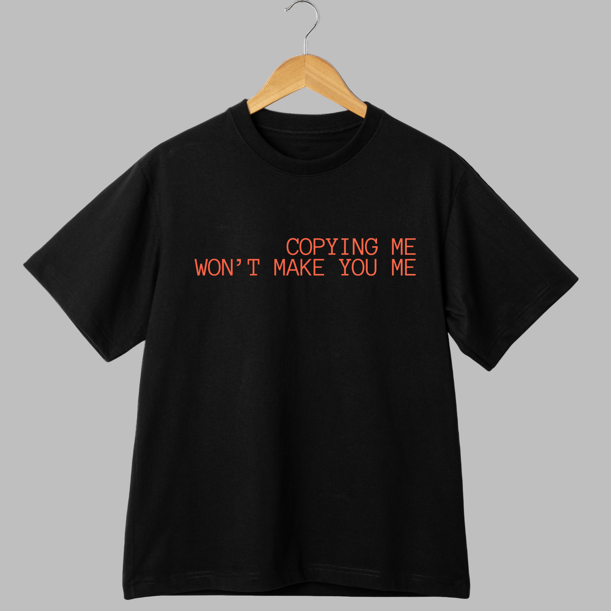Own the streets with attitude. Our "Copying Me Won’t Make You Me" oversized terry tee in jet black is made for those who lead, not follow. Crafted from premium heavyweight terry cotton for ultimate comfort and structure, this statement piece pairs a bold, high-contrast front print with an unapologetic message that shuts down imitators instantly. Dropped shoulders, relaxed fit, and a thick 260 GSM build make it a true streetwear essential. Wear it loud, wear it proud — originals don’t blend in.